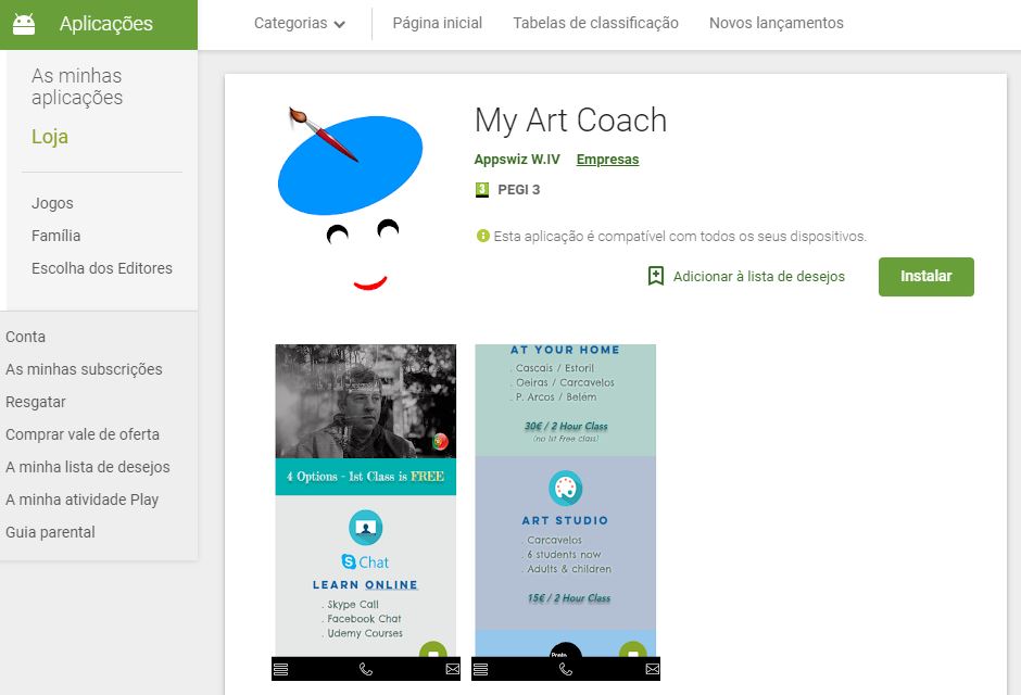 Esta é a minha nova App em sistema Android, já está disponível para download no Google Play Store. Se precisas de um formador de artes plásticas sempre presente, estarei online a todo o momento através desta App.